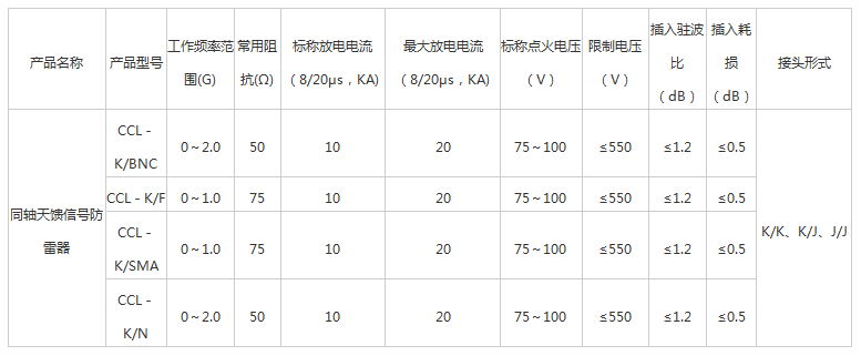 ●CCL-K系列同軸天饋信號(hào)防雷器串聯(lián)在被保護(hù)設(shè)備與天饋線通道之間,輸入端與天饋通道相連。用2.5mm2以上多股銅芯線把天饋防雷器接地端子與接地排牢固連接,接地線盡可能短而直。請(qǐng)根據(jù)設(shè)備類(lèi)型,接口形式,工作頻率,特性阻抗等不同要求進(jìn)行選型。